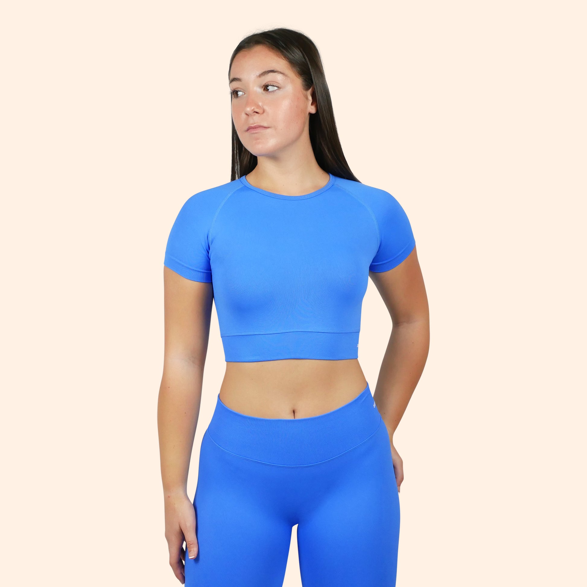 El tejido compacto crea un acabado limpio y definido, realzando la silueta sin necesidad de ajustes constantes. Las mangas cortas aportan una cobertura equilibrada que favorece el movimiento en entrenamientos dinámicos, cardio o fuerza.